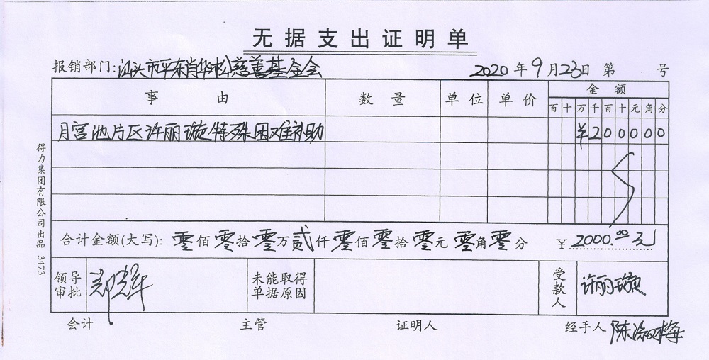 | 6 | 陈洁茵 | 货币 | 当面交付 | 重病救助 | 2020-09-16 | 5000.00 | | 20200916 |