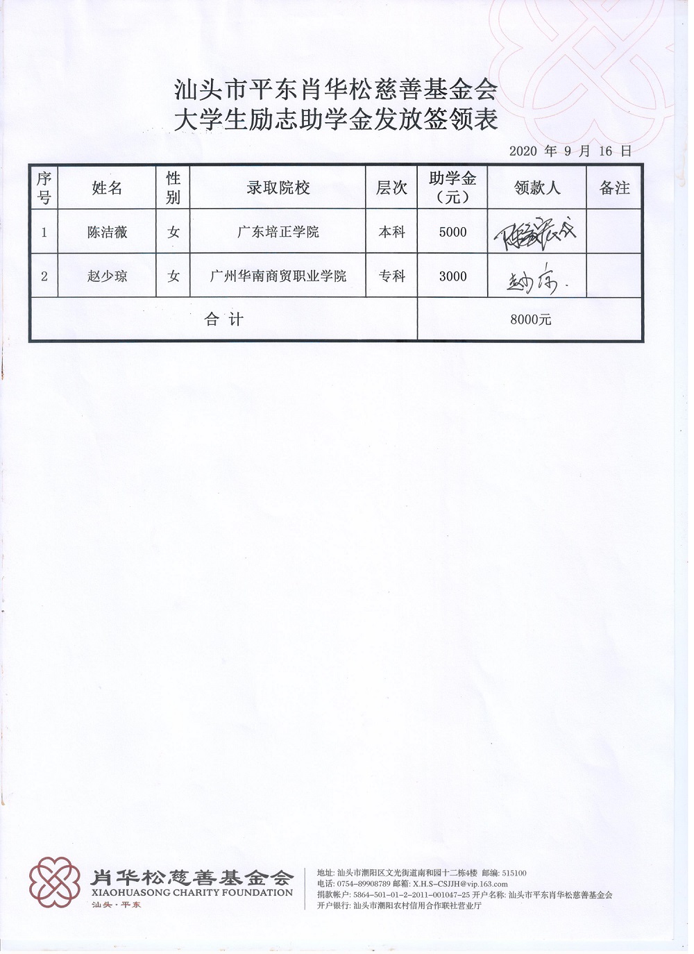 | 5 | 2020年度2位贫困大学生 | 货币 | 现金支付 | 励志助学金 | 2020-09-16 | 8000.00 | | 2020091602 |