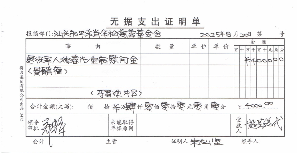 | 18 | 姚春光 | 货币 | 现金支付 | 拥军优属 | 2025-08-20 | 4000.00 | | 2025082003 |