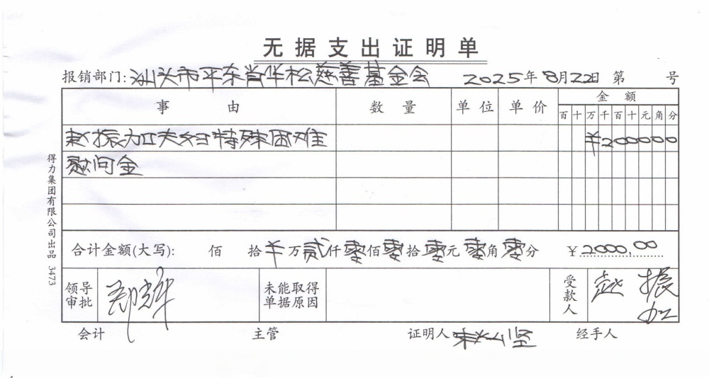 | 17 | 赵振加夫妇 | 货币 | 现金支付 | 特殊困难 | 2025-08-22 | 2000.00 | | 20250822 |
