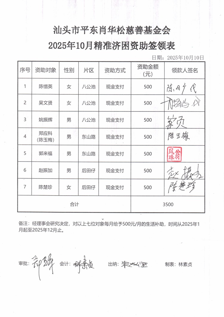| 7 | 2025年10月份精准济困7户 | 货币 | 现金支付 | 济困 | 2025-10-10 | 3500.00 | | 20251010 |