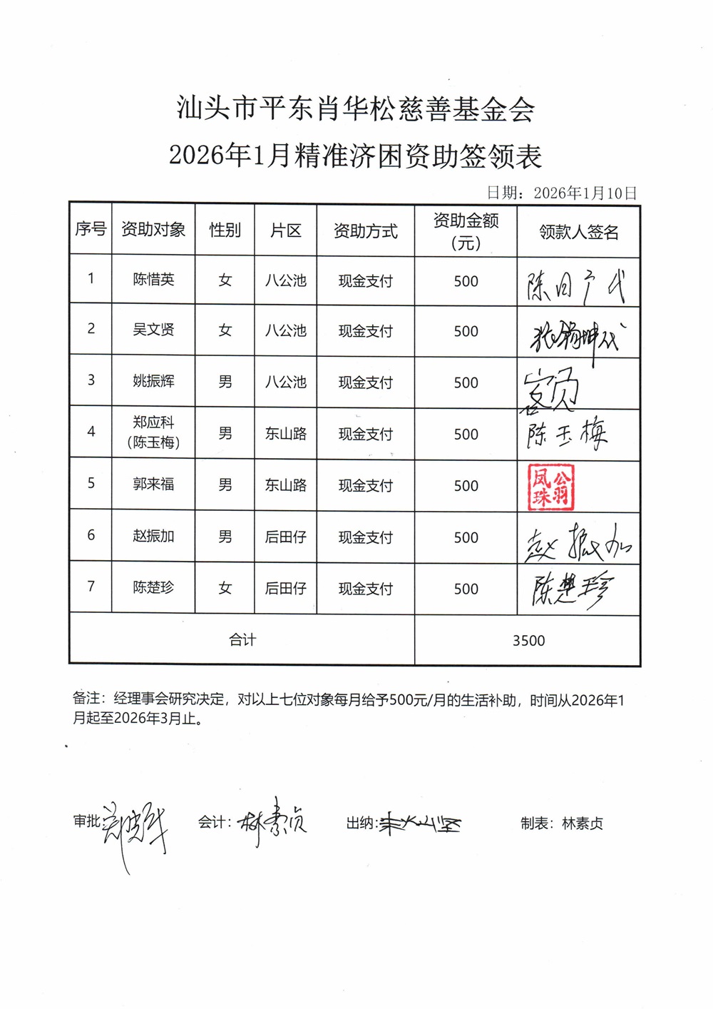| 2 | 2026年1月份精准济困7户 | 货币 | 现金支付 | 济困 | 2026-01-12 | 3500.00 | | 20260110 |
